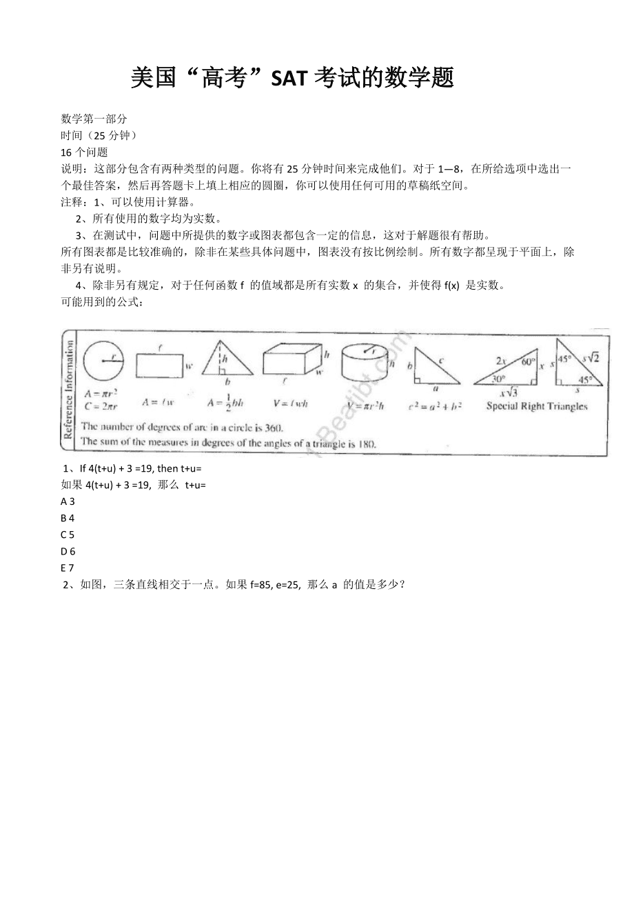SAT数学重视问题情境的设置,情境丰富多样,覆盖了日常生活中的诸多情况,缩小了学生与数学的距离,有利于培养学生应用数学意识和学习数学的兴趣。