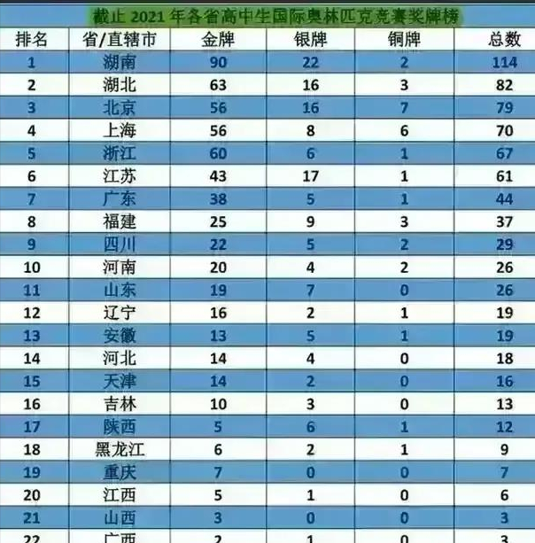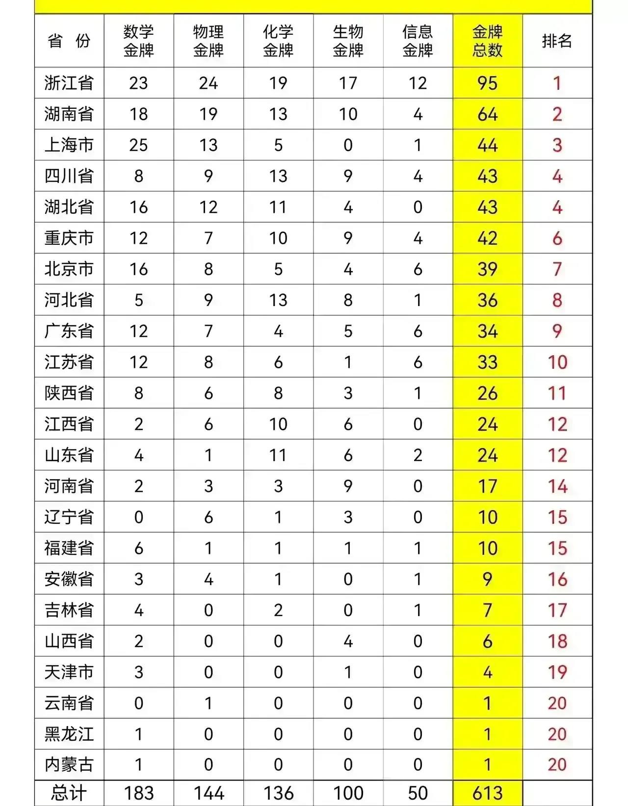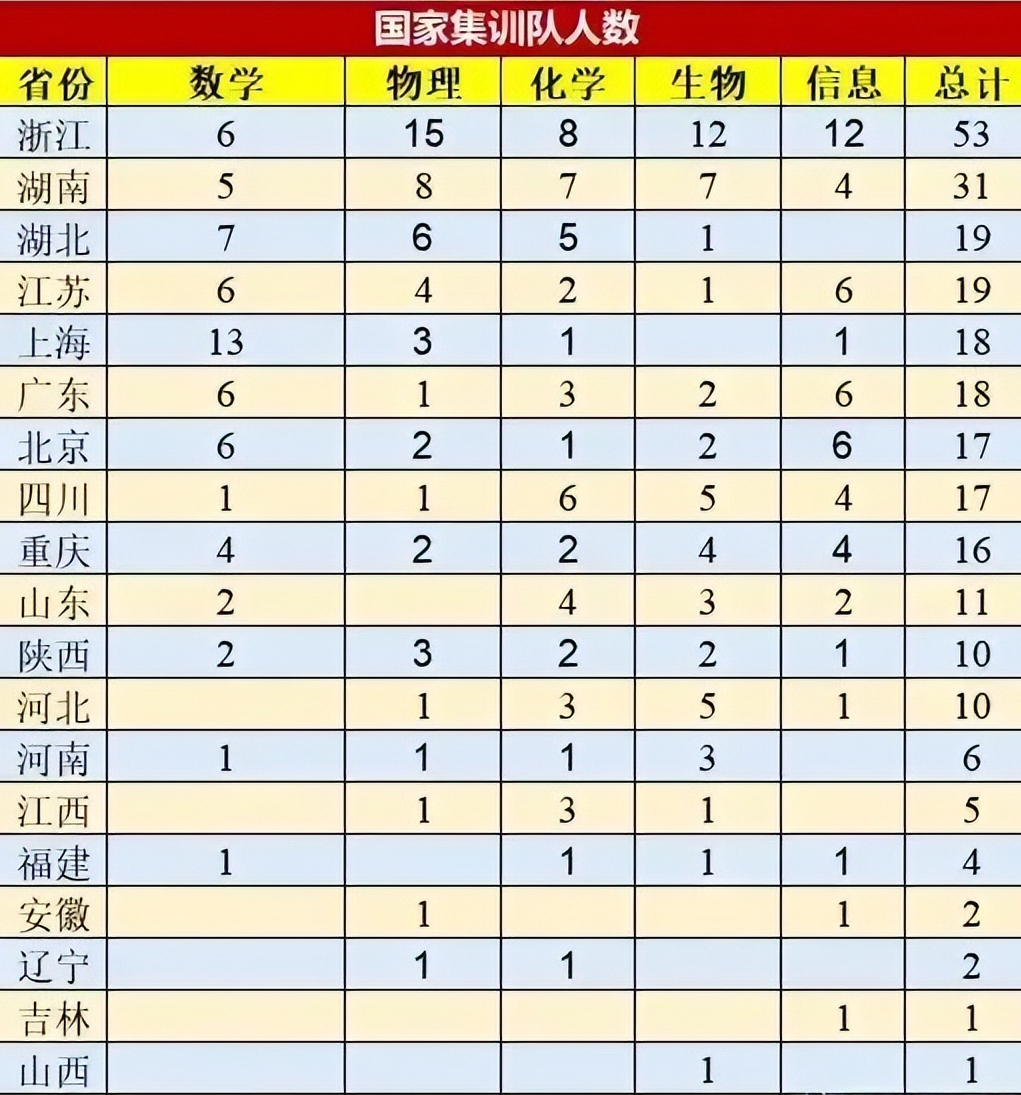 总体来说,五大学科竞赛成绩基本反映了各省基础教育的发展水平,北京、上海由于总人数少,但拔尖人才也不少,所以这两市队员在国家队基本不会缺迟。江浙、两湖,山东,是传统的教育强省,取得不俗成绩也在情理之中,至于说有些省份无一人入选国家队,确实基础教育还得加强。