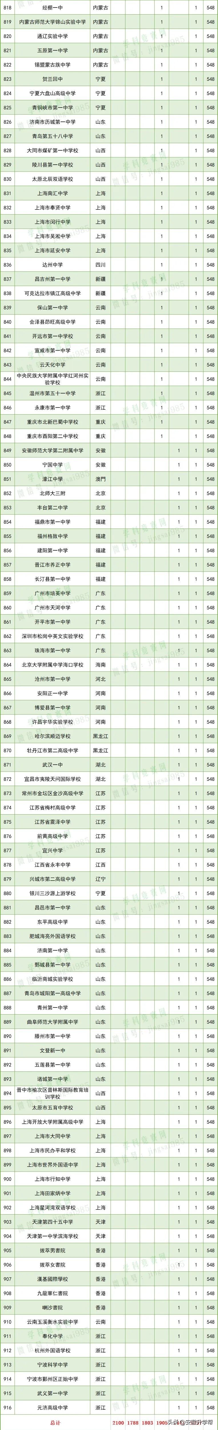 进入前20强的还有山西大学附属中学、郑州外国语学校、西工大附中(含分校)、华东师范大学第二附属中学(含紫竹校区)、济南市历城第二中学、华南师范大学附属中学、上海市上海中学、深圳中学、长沙市雅礼中学、长郡中学(含麓山国际实验)。