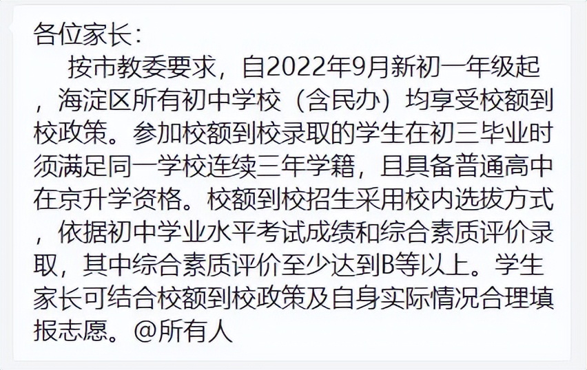 从2022年9月起,就是2025届中考的学生,海淀区所有初中校都享受校额到校的政策。