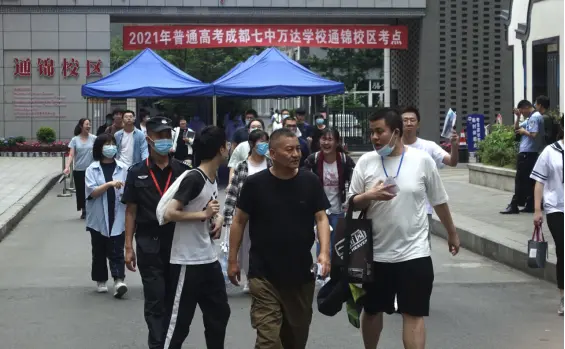 2021年6月8日,梁实(中)走出考场,自称考得不理想,来年继续争取考川大。 (视觉中国/图)