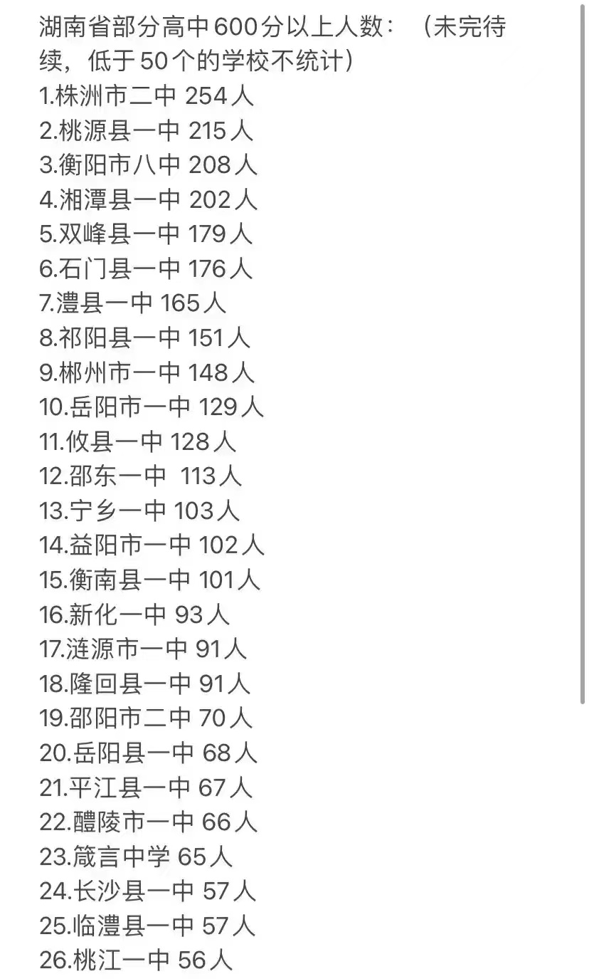 三、株洲市和衡阳大爆发。株洲市最强高中是株洲市二中,今年有1000毕业生,有17人达清北分数线或强基计划门票,预计有10人以上被清北录取。一本率达91.73%,600分以上人数为254人。这个成绩一举超过桃源县一中,有望成为全省第五名。
