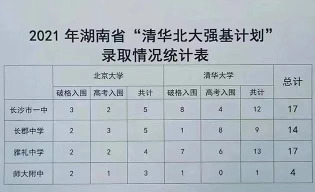 另外国家还有国家贫困专项计划,那些农村贫困地区的学生会降分录取。而强基计划湖南省的入围分数线清华651 分 (理科)、北大653分 (理科),并且对于那些大五大学科竞赛中获得金牌、银牌的选手可以直接入围强基计划。事实上2021年长沙四大名校就有52人被清华北大强基计划录取。