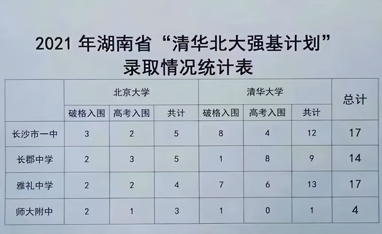 我们再看看2021年湖南省通过强计划进入清华北大的人选,也全部出自长沙市四大名校。