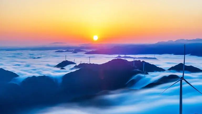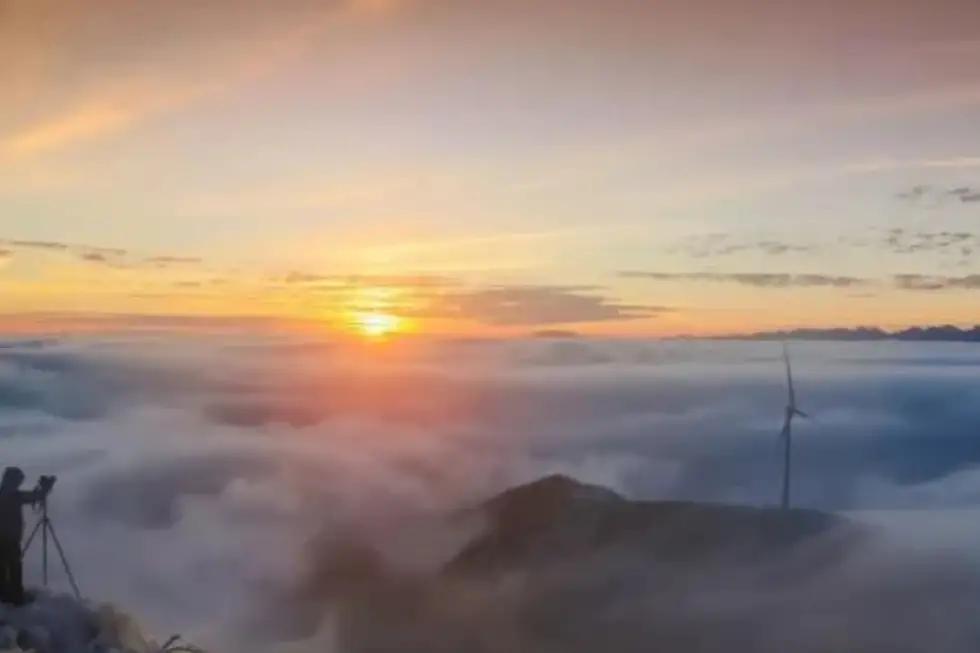 而此时不管你在铁索桥,还是在一脚踏两省打卡点,你会发现云朵一层层把你团团围住,在山顶观景平台,你站在景区特意为你准备的望远镜下,会发现昔日一座高大挺拔的山峰,如今只露出一个尖尖头,山顶风车在云海中时隐时现,如同你坐在飞机里观云海一般,让登高赏景的游客沉醉其中。