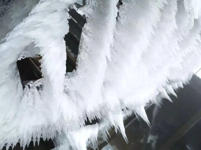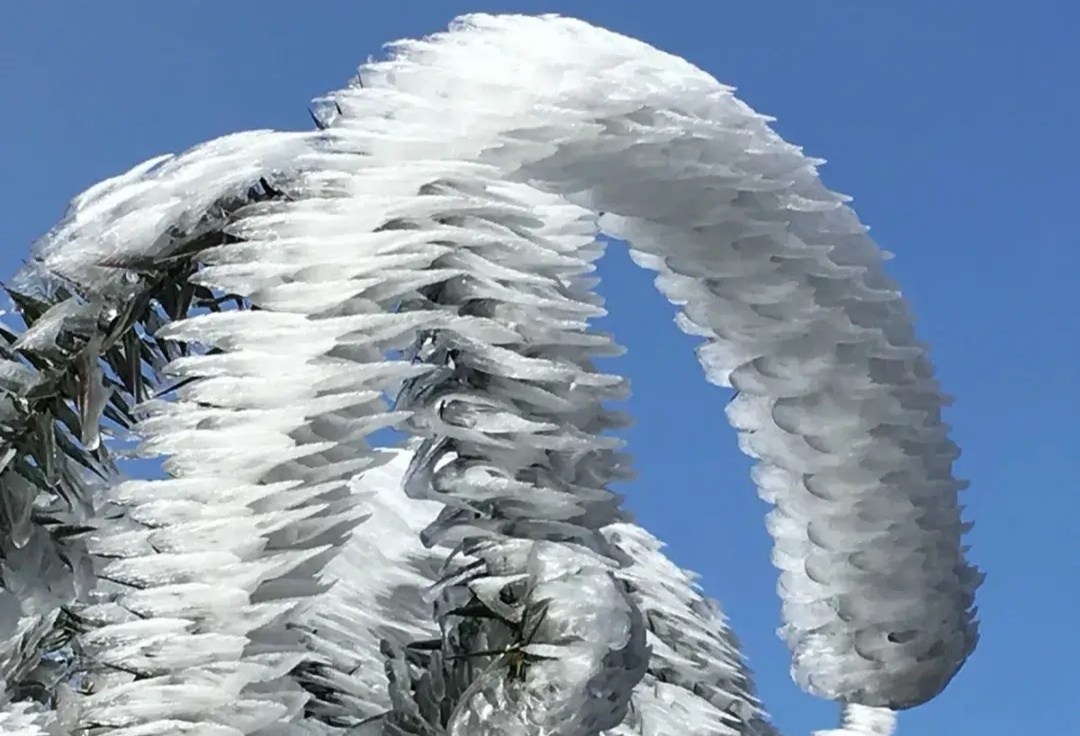 进入12月份以后,北方冷空气频频南下,在云冰山形成冷湿气流强烈交锋,附在树枝上或者物体表面上的水气受冷空气作用,形成雾凇,晶莹剔透,美轮美奂。