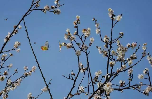 一度开花稀少,一般在12月中旬至下旬,梅花是欲露还藏的花骨朵;二度开花大片绽放,一般在1月初至中旬,满树飘白,盛开在枝头白茫茫一片;三度开花稀落,有绿芽相伴,象征着冬去春来。