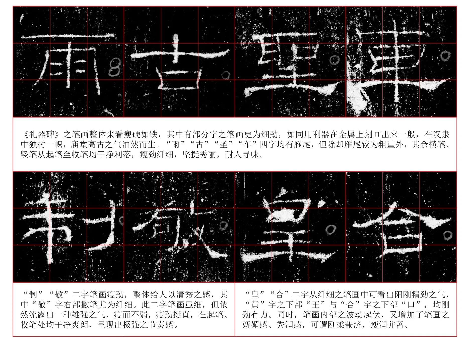 《礼器碑》通篇给人以骨质瘦硬、精奥奇崛之印象,线条细瘦执拗,极富骨力。清王澍《虚舟题跋补原》评云:『隶法以汉为极,每碑各出一奇,莫有同者;而此碑尤为奇绝,瘦劲如铁, 变化若龙,一字一奇,不可端倪。』《礼器碑》 笔画瘦劲,富有阳刚苍劲之感,以瘦硬而有神采之艺术风貌冠绝于世。在中国书法史上,能够运用纤细笔画表现出穿金刻玉之力量,此碑乃最好之典范 。 见表三 。