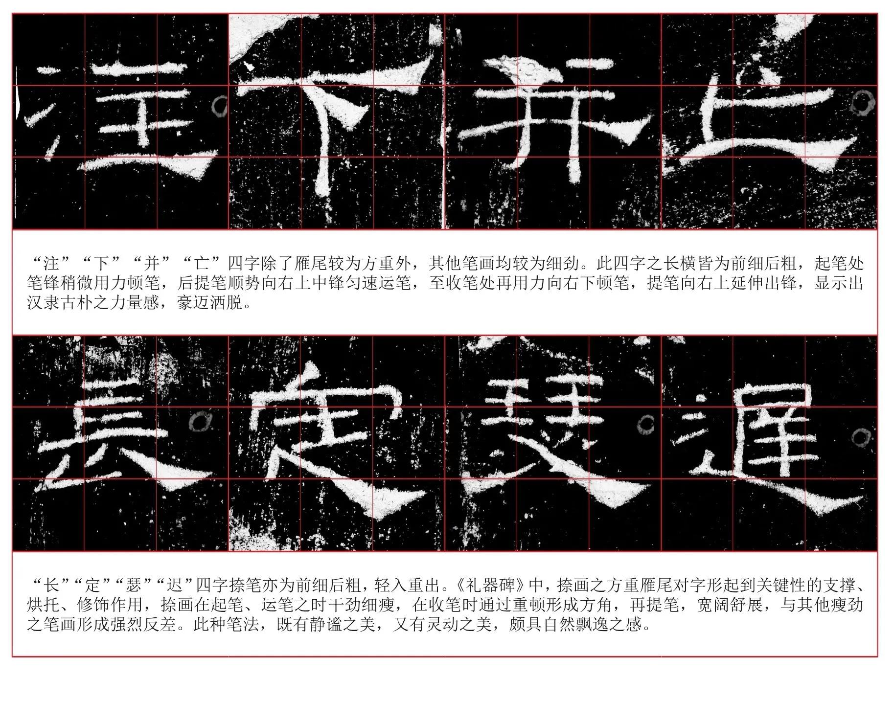 《礼器碑》用笔劲健爽朗,斩钉截铁,自然天成。该碑之用笔异于其他汉碑,取势干劲犀利,除波磔之外起伏不大,中锋行笔,力透纸背,犹如铁锥画沙,娴熟自如。其笔画纤细而刚健有力,波磔简洁厚重,又不乏灵动之气。方圆并举,是汉隶清秀刚健一类风格之典型作品,观其笔迹 , 刚劲有力 , 变化若龙 。 具体分析 如下 :