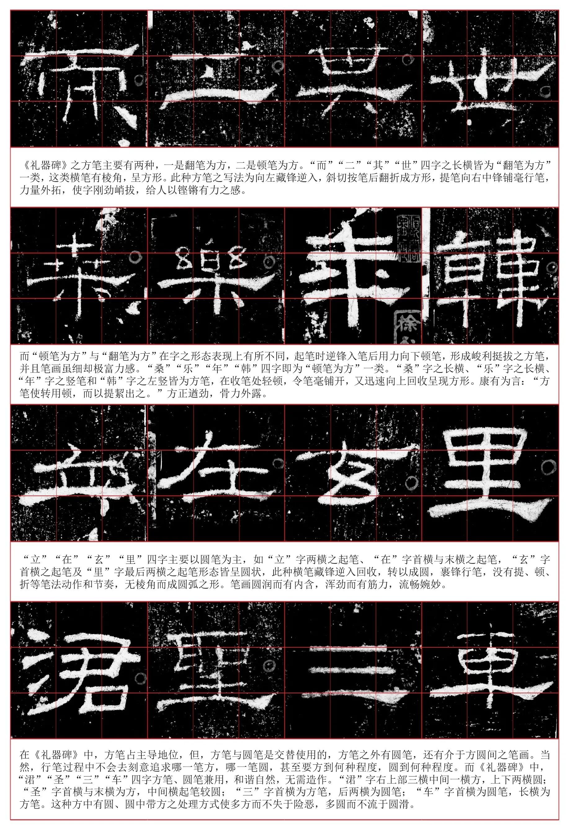 清杨守敬在《学书迩言》有语:『西汉分书今亦罕存,东汉则林立百数,自王蒻林极力推崇《礼器》,声价遂为汉分第一。』 清郭尚先在《芳坚馆题跋》有云:『汉人书以《韩敕造礼器碑》为第一,超迈雍雅,若卿云在空,万象仰曜,意境尚当在《史晨》《乙瑛》《孔宙》《曹全》 诸石之上 , 无论他石 也 。 』 在此,笔者对汉《礼器碑 》进行解析,以求教于诸位方家、读者,不妥之处,敬请不吝赐教。