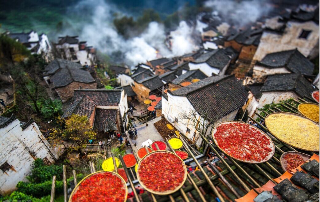 篁岭古村受山区地形限制,房屋高低排布、错落搭建,周边古木参天、梯田密布,实在没有更多的土地形成晒场。晒晾农作物只能使用竹匾在各家眺窗前木架或房顶上,自古如此,形成了色彩惊艳的独特的“晒秋”农俗景观和充满古韵的"晒秋"文化田园风光起源地。
