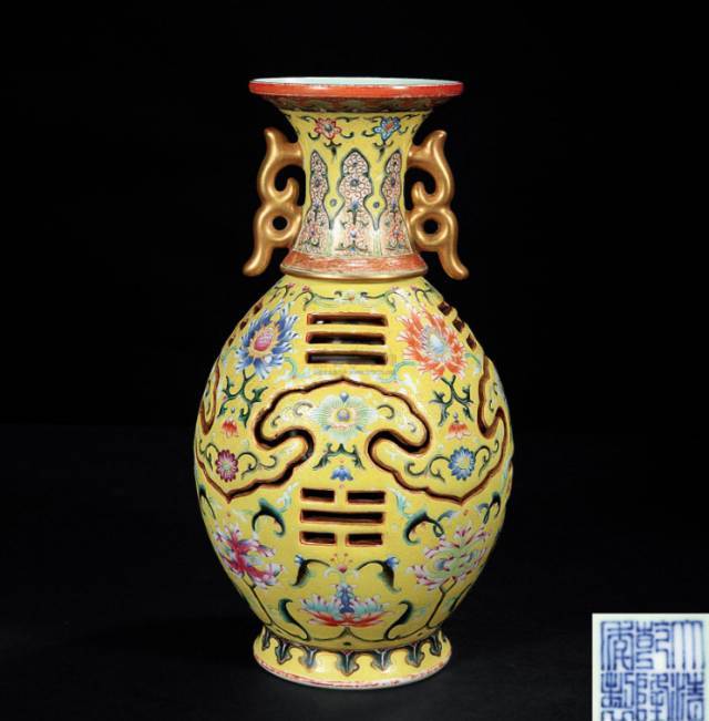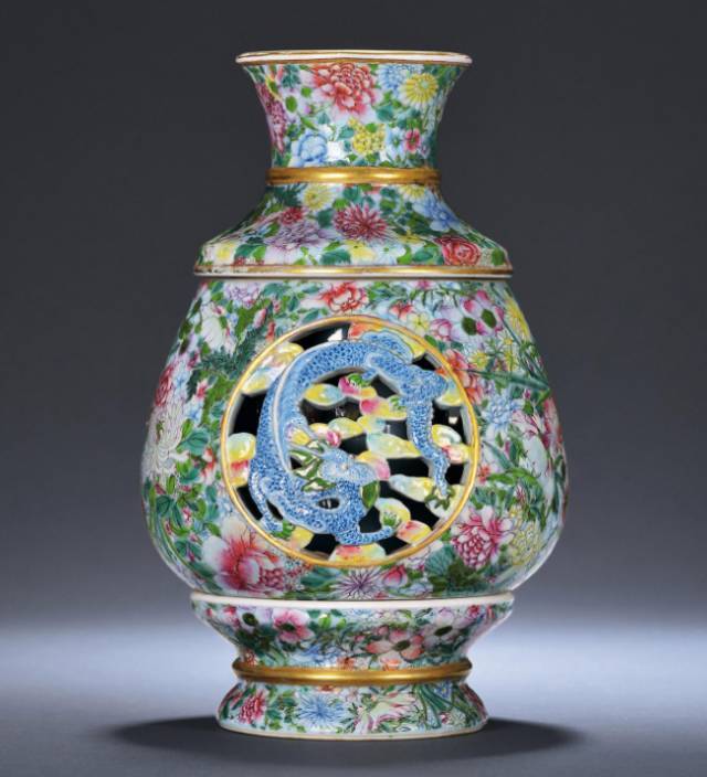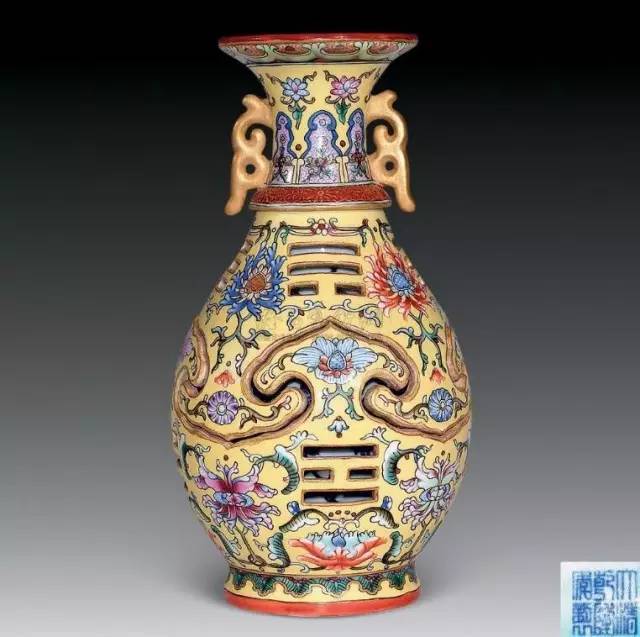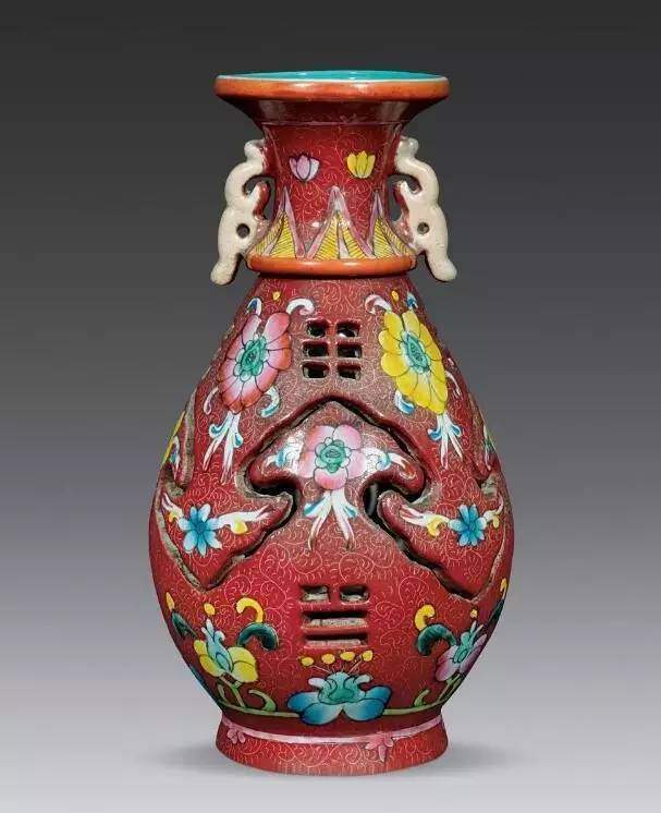 器腹中段镂雕成如意头形,套钩回纹或倒、正T形。瓶体上下于纹饰间相互钩套、连为一体,可以活动却不能分开,寓意"天地交泰",为清代乾隆早期御窑厂督陶官唐英和催总老格刻意制作专供乾隆皇帝玩赏的佳器,传世品极少。