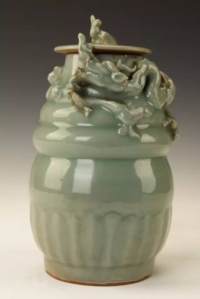 初为明器。因瓶的颈、肩处堆塑一条蟠龙,故名。亦称“扳依瓶”或“招魂瓶”。长颈,有盖,盖顶钮塑成虎、凤、鹤等各种形式,圆腹、圈足。常见于宋、元明各代。