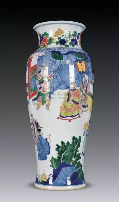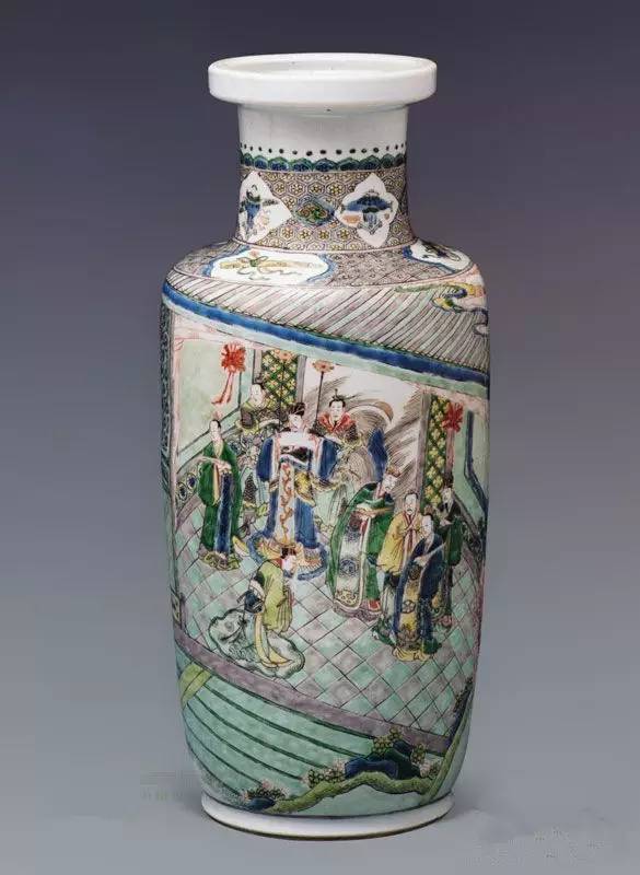 象腿瓶,即一统瓶,瓶形为广口外撇,短颈,肩部宽与口相若,身如直筒状,平底,造型如粗壮的象腿,所以又名“象腿瓶”。因“筒”与“统”谐音,有“大清天下一统”的寓意。多见于清初顺治、康熙两朝,品种有青花、五彩。