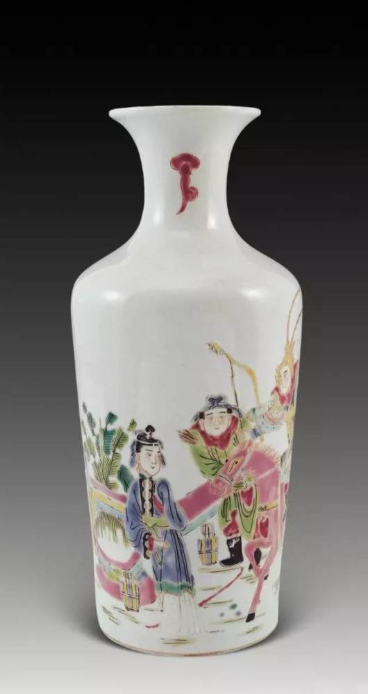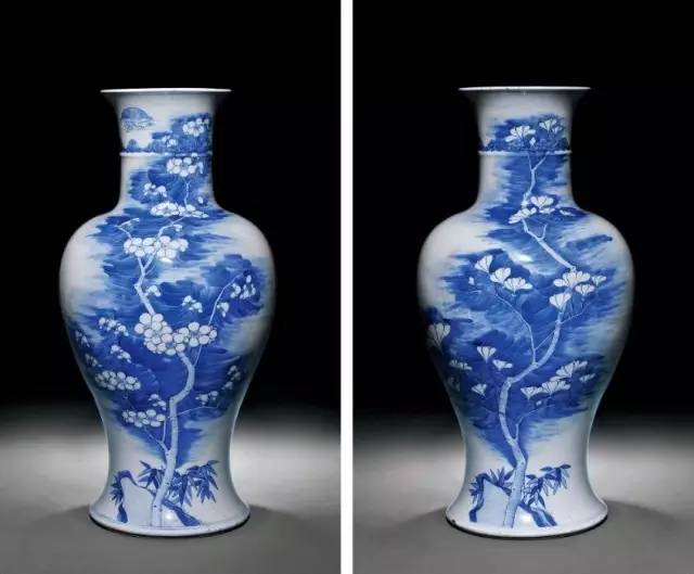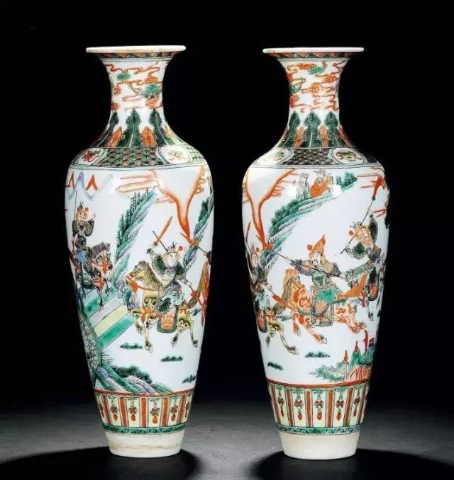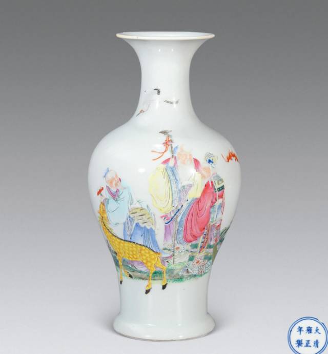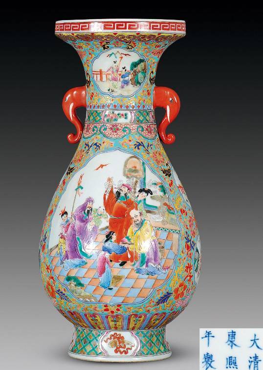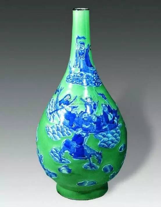 康熙早期的棒槌瓶,器形偏矮,康熙中期以后的棒槌瓶,器形趋于细长,为了与雍正时期的棒槌瓶相区别,取名硬棒槌瓶。常见的有青花、五彩、洒蓝描金、五彩开光等品种。