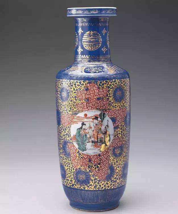 清康熙洒蓝釉五彩人物图棒槌瓶