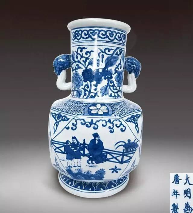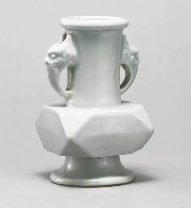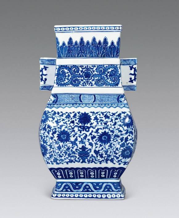 明宣德年间景德镇窑烧制的一种瓶式,仅有青花器。器呈唇式微侈口,直颈两侧贴塑兽耳,八棱锤形方腹,深圈足外撇,内台阶式底。清代雍正官窑青花四方倭角瓶,尺寸较大,做工很好。乾隆时期仿品颈侧兽耳较小,底足较矮。