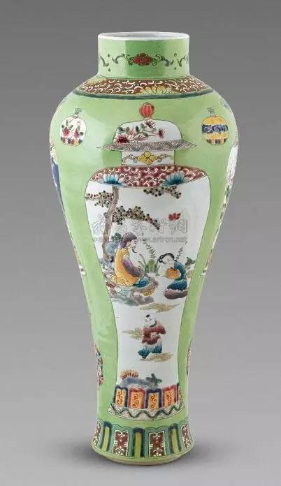 又称“观音尊”,流行于清代康熙至乾隆时期。康熙一朝景德镇窑烧制的瓶式很多,有时瓶、尊在称呼上不易区分,一般来说,凡口小腹大的均称为瓶。观音瓶特征是侈口,颈部较短,丰肩,肩下弧线内收,至胫部以下外撇,浅圈足,瓶体修长,线条流畅。