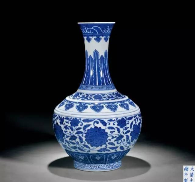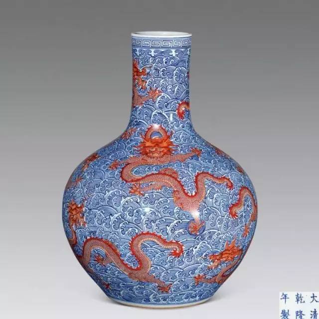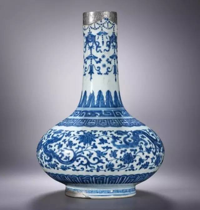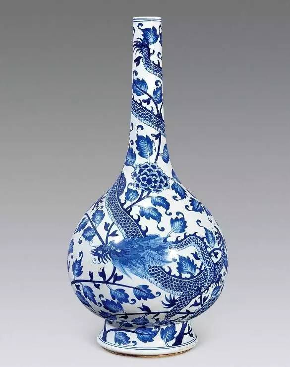天球瓶是受西亚文化影响极深的一种瓷器造型,创烧于明代永乐、宣德年间的景德镇窑,多见青花。以海水龙纹为贵。永乐朝开始成为观赏式瓶,宣德年间较为流行。瓶形为小口、直颈、丰肩、假圈足、砂底微凹。因圆球腹硕大,像是从天降下来似的,故名。