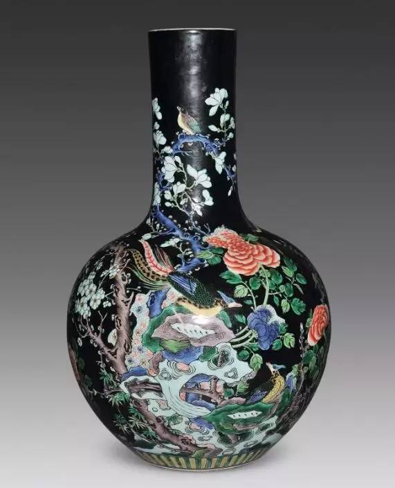 清晚期墨地五彩雉鸡牡丹图天球瓶