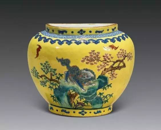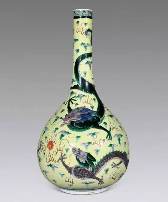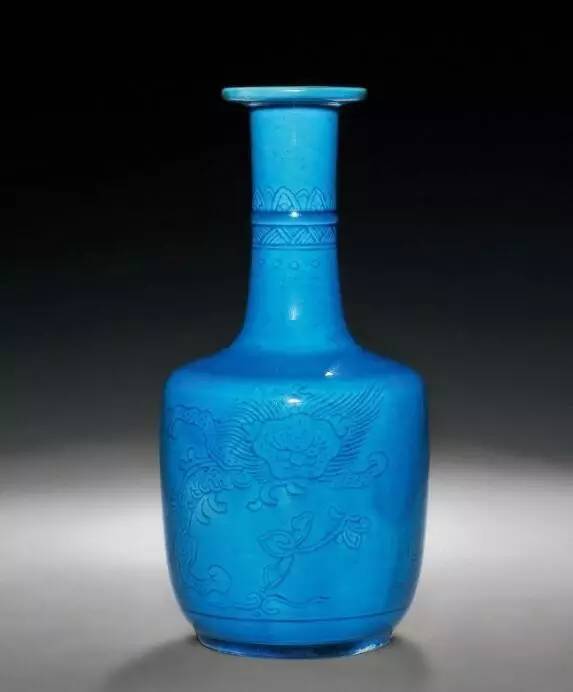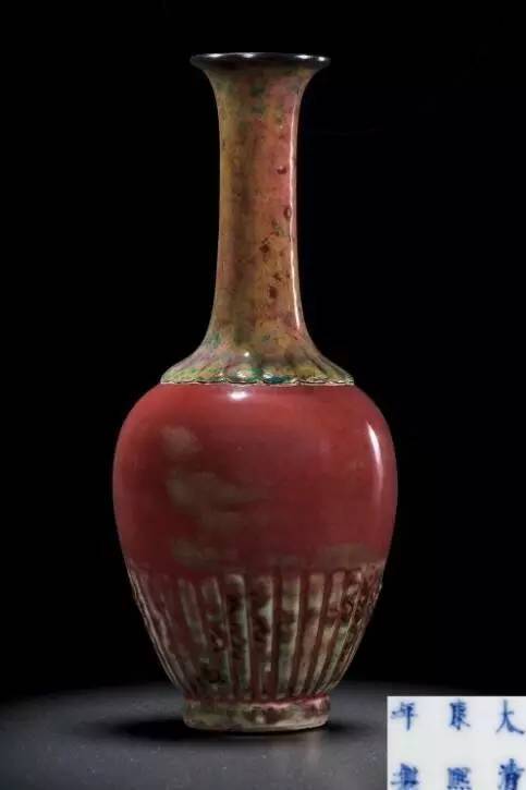 造型为撇口,长颈,溜肩,敛腹,圈足,下腹部浮雕一周菊花瓣为饰。为清代康熙朝独特器形之一。