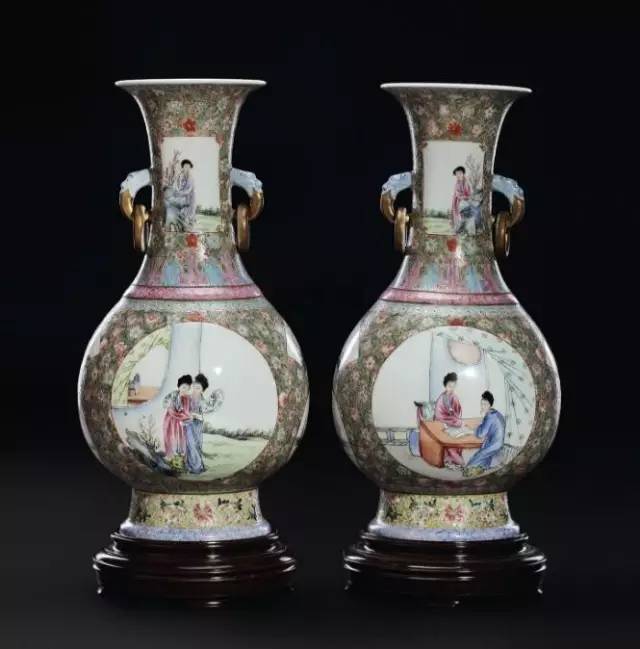 民国粉彩万花地开光仕女活环瓶 (一对)