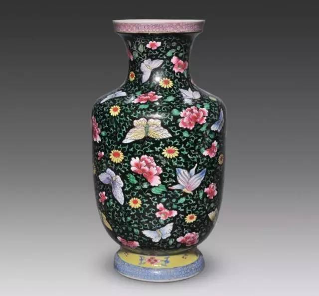清雍正墨地粉彩花蝶纹灯笼瓶