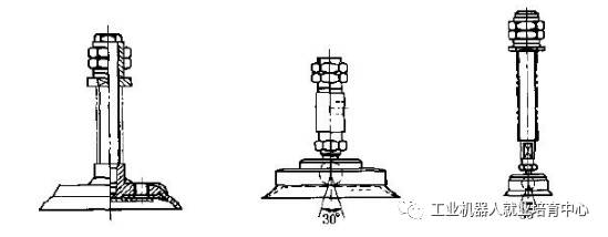 其真空的产生是利用真空泵,真空度较高。主要零件为碟形橡胶吸盘1,它通过固定环2安装在支承杆4上。支承杆由螺母5固定在基板6上。取料时,碟形橡胶吸盘与物体表面接触,橡胶吸盘在边缘既起到密封作用,又起到缓冲作用;然后真空抽气,吸盘内腔形成真空,实施吸附取料。放料时,管路接通大气,失去真空,物体放下。为避免在取放料时产生撞击,有的还在支承杆上配有弹簧,起到缓冲作用。为了更好地适应物体吸附面的倾斜状况,有的在橡胶吸盘背面设计有球铰链,。