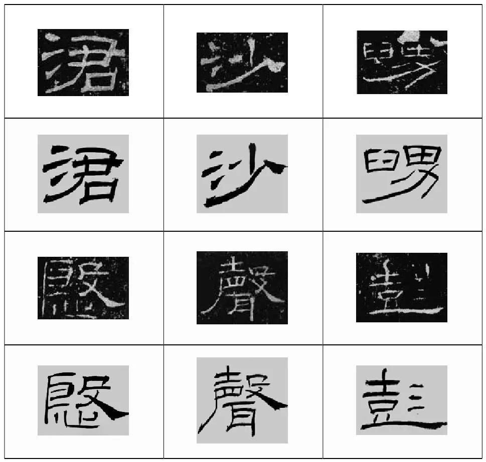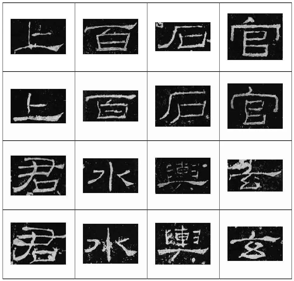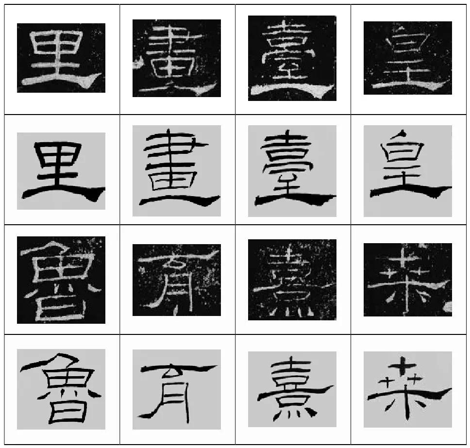 在《礼器碑》中有不少重复出现的字,但它们的形态却不尽相同。轻重提按,方圆曲折,看似刻意为之,实则自然天成,无意于佳乃佳。正如清王澍《虚舟题跋》中评云:“变化若龙,一字一奇,不可端倪。”