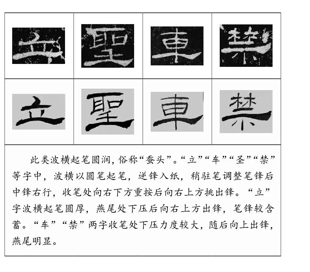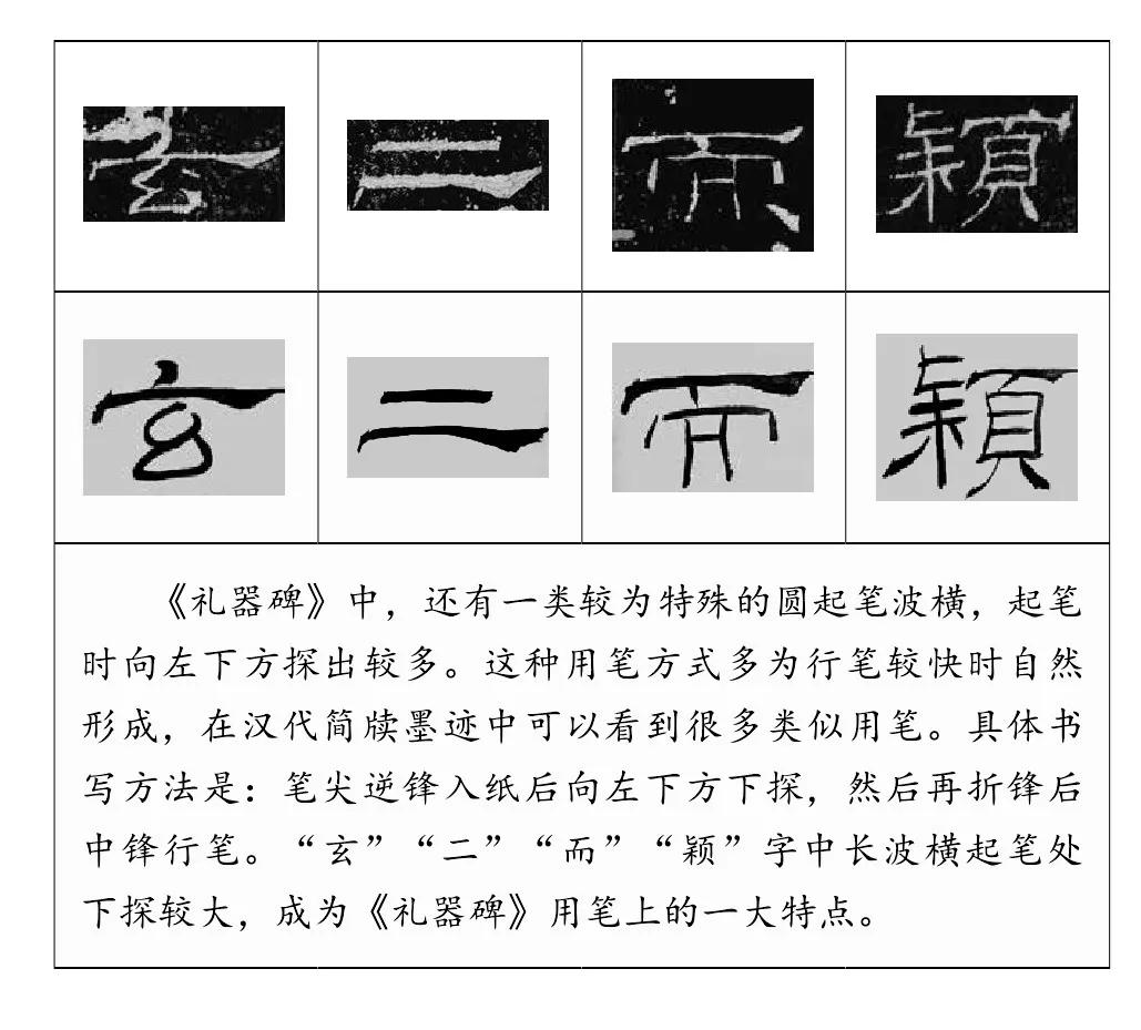 波横最明显的特征就是“蚕头燕尾”,是隶书的标志性笔画之一。隶书波横的一般书写方法为:逆锋起笔,向左下方压笔,再顺势向右上方推,提笔右行,在收笔处重按后提笔出锋。《礼器碑》中波横表现十分丰富,从起笔形态上可分为圆起笔、方起笔两大类。