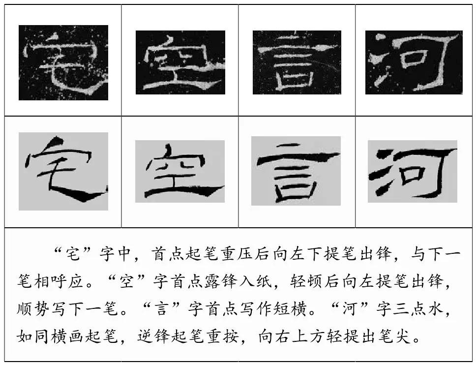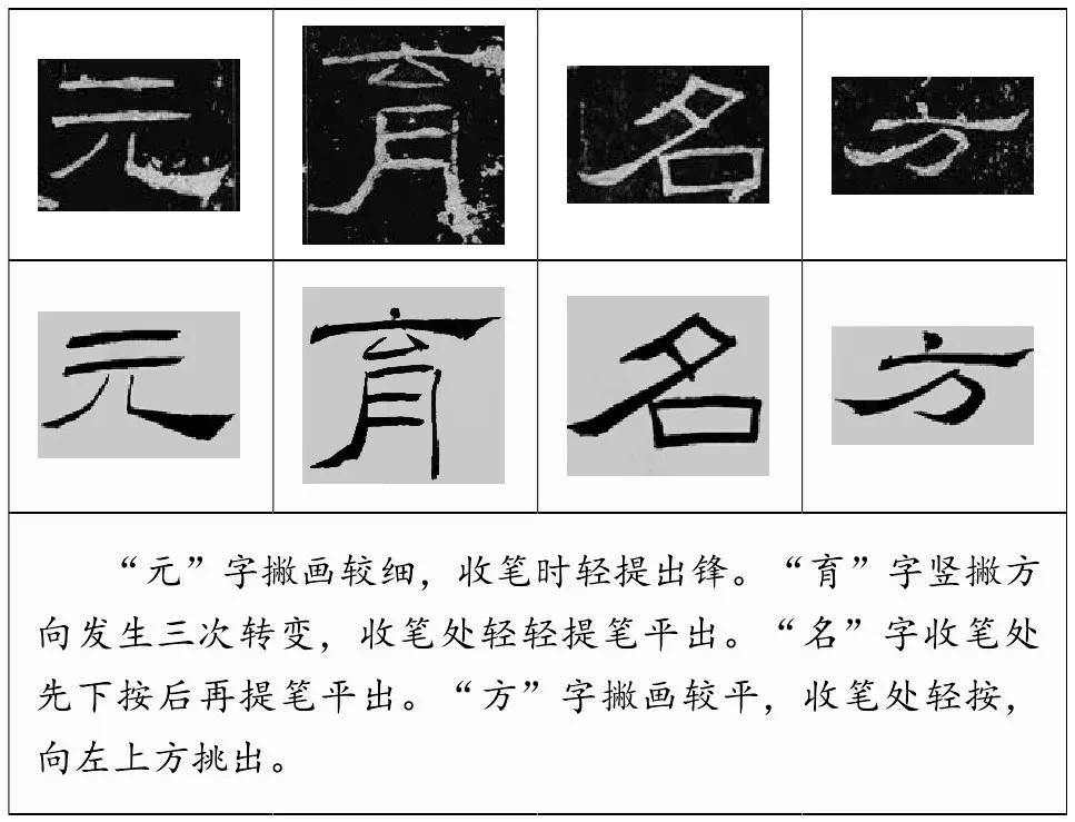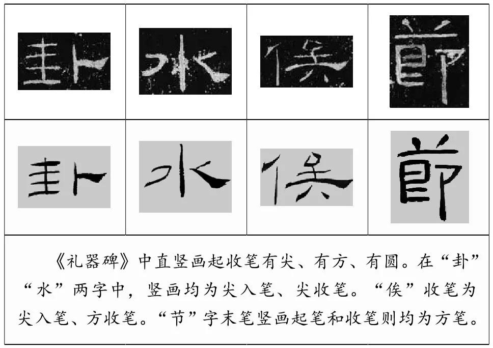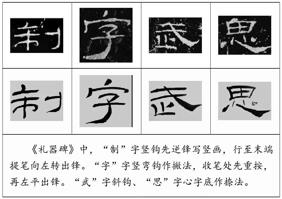 清刘熙载曾云:“凡书要笔笔按,笔笔提。”“书家于提、按二字,有相合而无相离。故用笔重处正须飞提,用笔轻处正须实按,始能免堕、飘二病。”习字时要体会提按二字,这样书写出来的点画才具有生命的活力,才有笔墨意趣。《礼器碑》中笔画富于变化,即是在提与按的用笔过程中形成的。