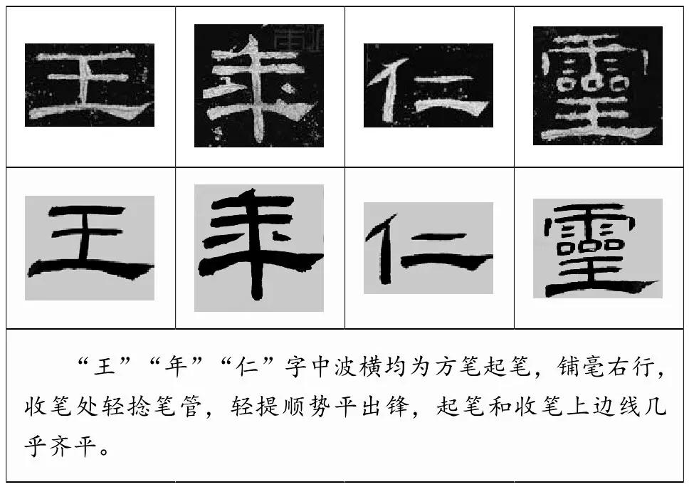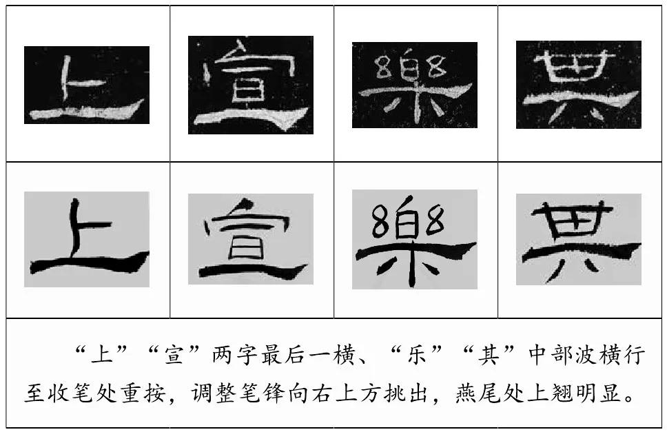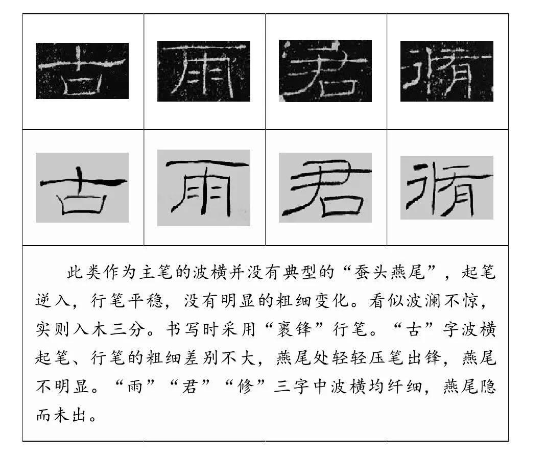 此外,在《礼器碑》的波横中,还有一些横画做了特殊处理,有些波横画并没有同时强调蚕头、燕尾,而只是对燕尾进行了强调。