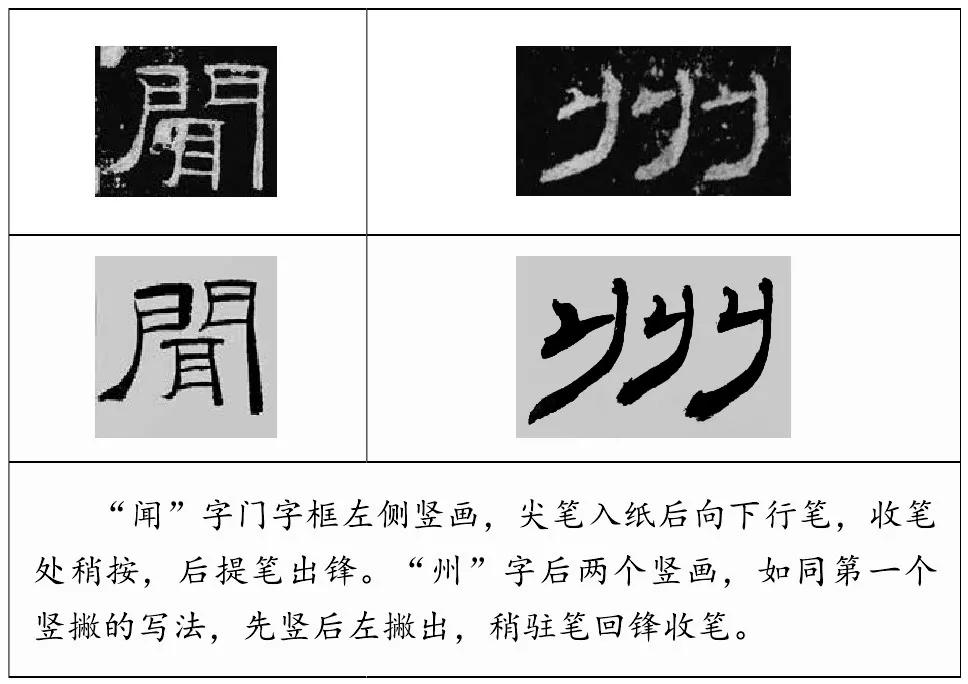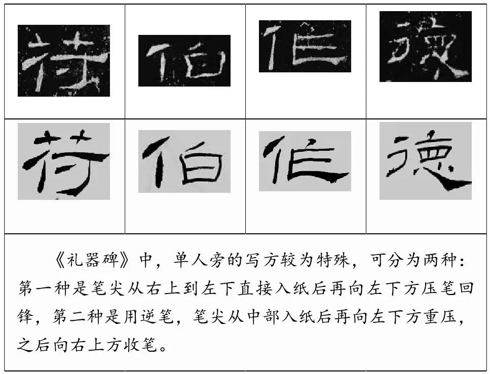 《礼器碑》中,左边的竖画绝大部分不作直画,而是如同竖撇一样,到收笔处,笔锋稍按,再向左行笔。