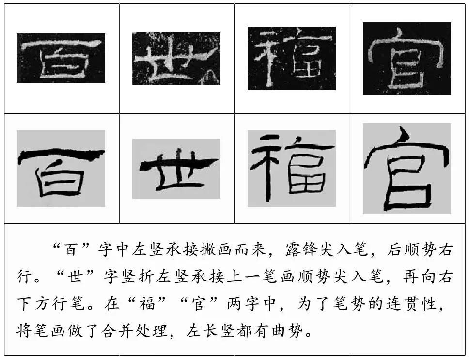 曲的笔画是《礼器碑》的一大特色,其形成的原因应该是为了承接上一笔,入笔时自然形成。曲笔的出现使得整个字变得灵动活泼。书写时切记不能刻意为之,初学者可以先将曲笔竖画写直,待临习积累到一定量的时候,曲笔将会在书写过程中自然带出。