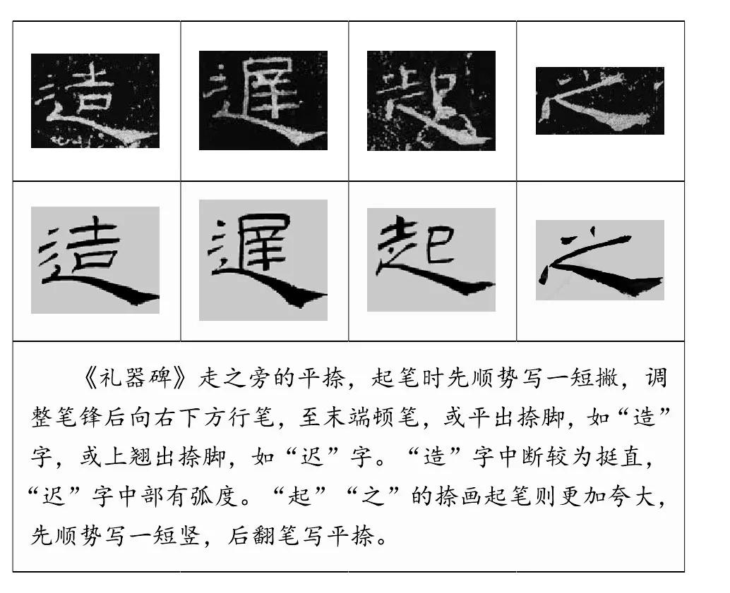 《礼器碑》走之旁的平捺,起笔时先顺势写一短撇,调整笔锋后向右下方行笔,至末端顿笔,或平出捺脚,如“造”字,或上翘出捺脚,如“迟”字。“造”字中断较为挺直,“迟”字中部有弧度。“起”“之”的捺画起笔则更加夸大,先顺势写一短竖,后翻笔写平捺。