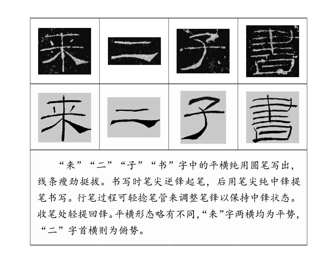 《礼器碑》中的平横的一般写法是逆入平出,与小篆的写法类似。起笔的时候笔锋先向左入纸,提笔后向右行笔,收笔时放慢速度提笔。平横从起笔和收笔处的字形上看,有圆笔和方笔两大类,书写方法有细微的不同。
