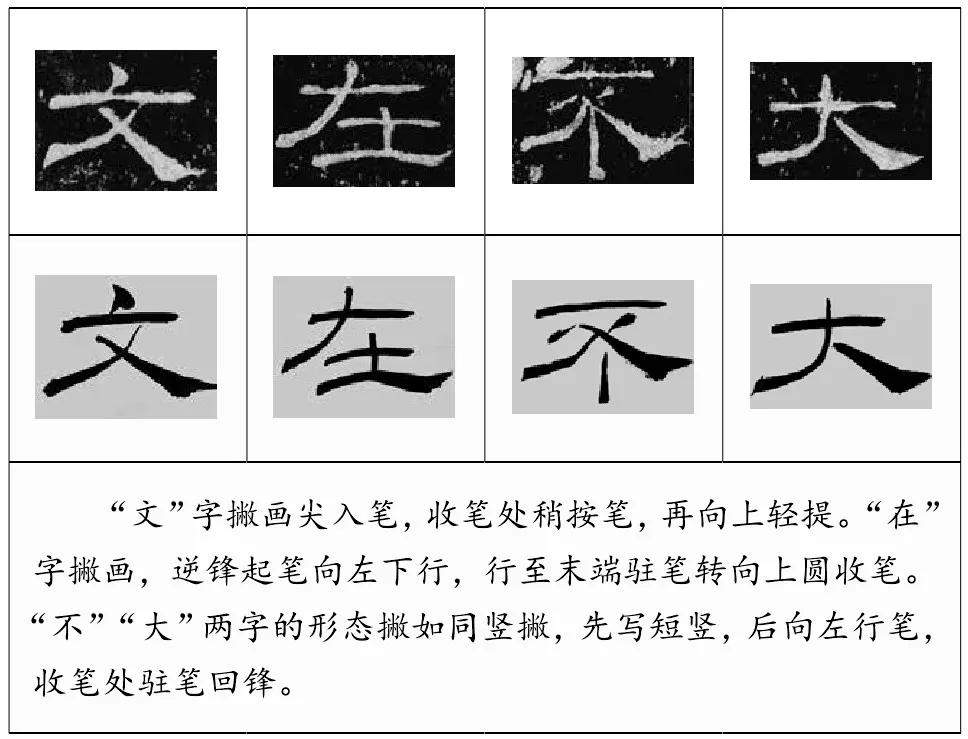 撇收笔处微微停顿后向上提笔回锋。回锋并非刻意为之,而是要保持书写的连贯性。如果过分强调回锋的动作,则会显得呆板。