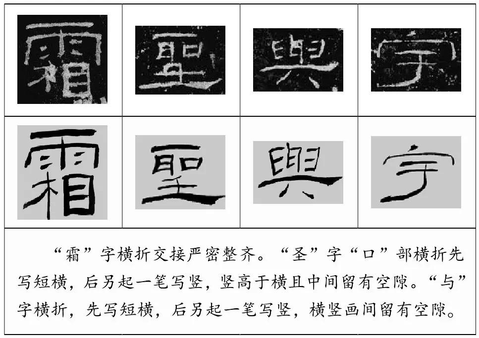 隶书中的横折是由横、竖两笔完成的。横折的写法为:横画至收笔处,另起一笔再写竖画。交接处横竖既可写得严丝合缝,也可在横竖之间留有空隙。《礼器碑》中大致有以下几种横折: