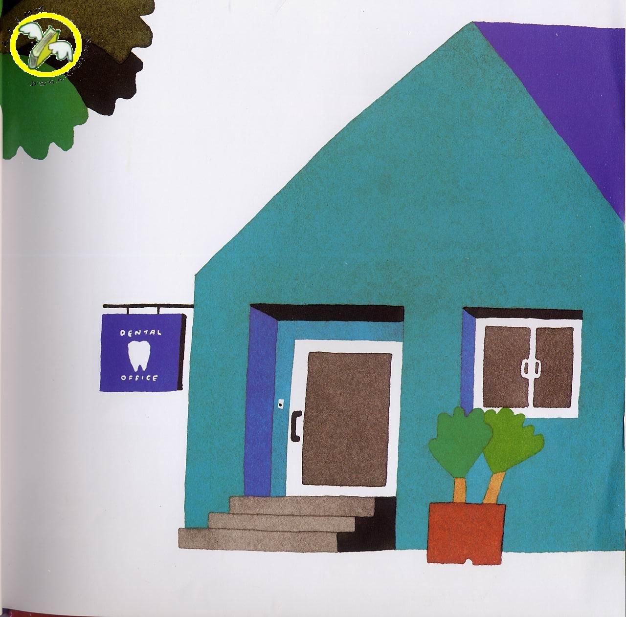那是一间绿色的小屋,房子的窗户下种着两棵小树,房子旁边还有一个蓝色的画着牙齿的招牌。