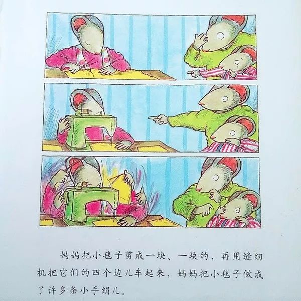 妈妈把小毯子剪成一块、一块的,再用缝纫机把它们的四个角车起来,妈妈把小毯子做成了许多条小手绢儿。