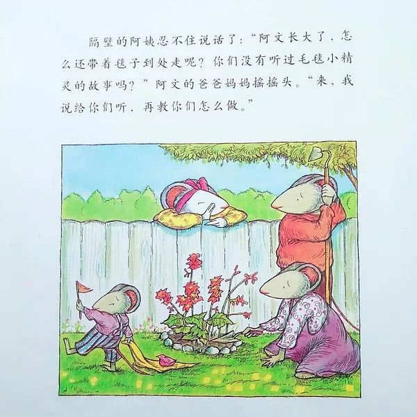 隔壁的阿姨忍不住说话了:"阿文长大了,怎么还带着毯子到处走呢?你们没有听过毛毯小精灵的故事吗?"阿文的爸爸妈妈摇摇头。"来,我说给你们听,再教你们怎么做。"