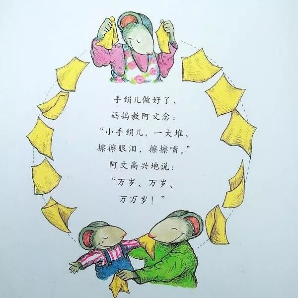 手绢做好了,妈妈教阿文念:"小手绢儿,一大堆,擦擦眼泪,擦擦嘴。"