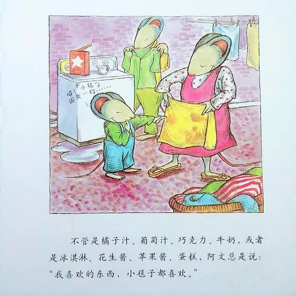 不管是橘子汁、葡萄汁、巧克力、牛奶,或者是冰淇淋、花生酱、苹果酱、蛋糕,阿文总是说:"我喜欢的东西,小毯子都喜欢。"