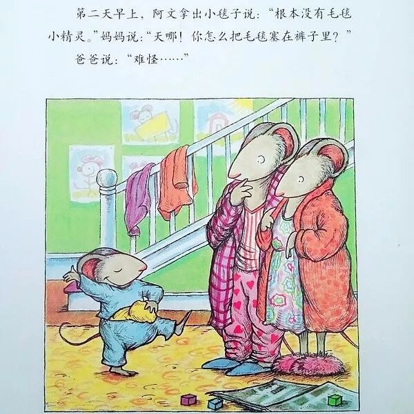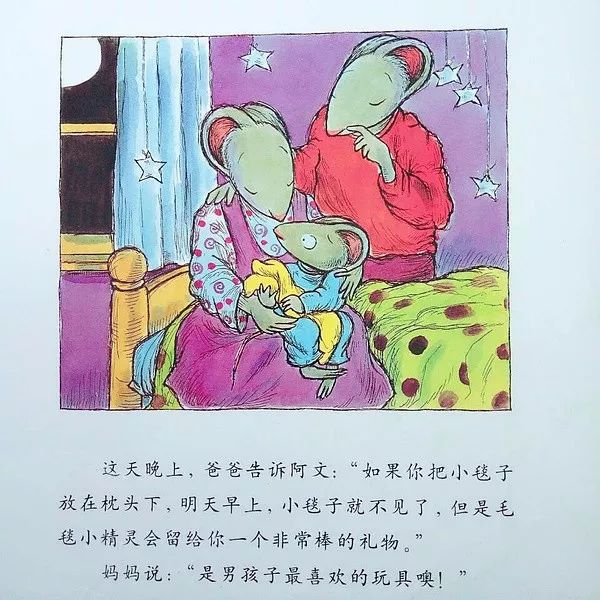 这天晚上,爸爸告诉阿文:"如果你把小毯子放在枕头下,明天早上,小毯子就不见了,但是毛毯小精灵会留给你一个非常棒的礼物。"