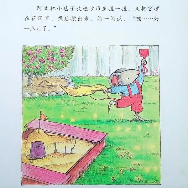 阿文把小毯子放进沙堆里搓一搓,又把它埋在花园里,然后挖出来,闻一闻说:"嗯……好一点儿了。"