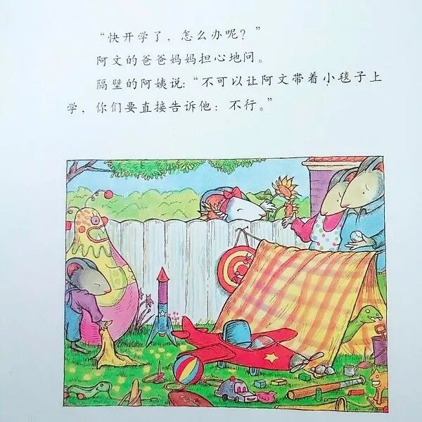 隔壁的阿姨说:"不可以让阿文带着小毯子上学,你们要直接告诉他:不行。"