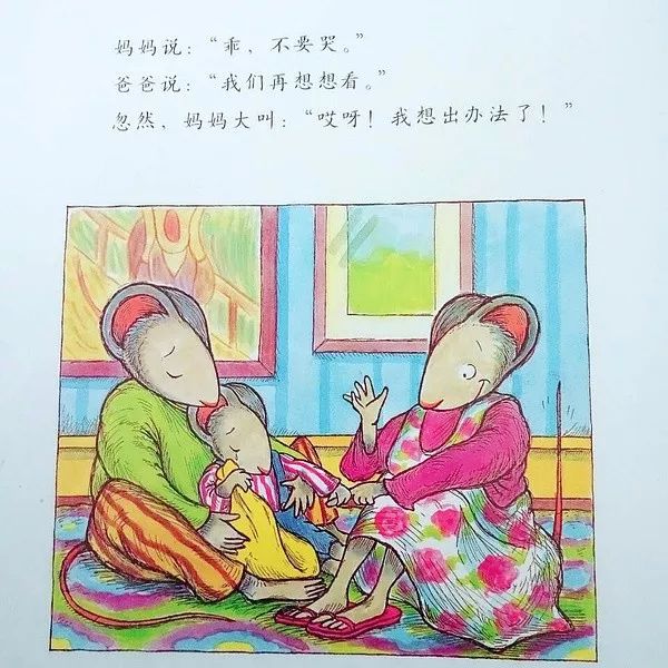 忽然,妈妈大叫:"哎呀!我想出办法了!"