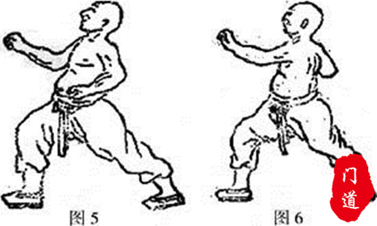 上动不停,体左转,右脚落地,双腿下蹲,双膝外展成马不步。左手变掌,掌心朝前架于头顶上方约10厘米处。右拳拳心朝下向右冲出,力达右拳。