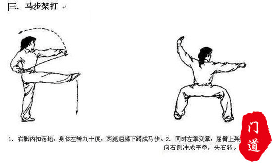 3、马步架打:右脚前落成马步,左拳变掌向上撩架,右拳向前击出成平拳。