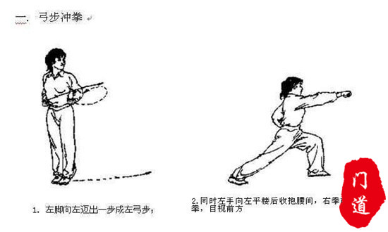 重心左移,右腿蹬直,左腿左弓成左弓步,同时,左掌变拳拳心朝上收于腰间同,体左转,右拳拳心朝下向前冲出,力达于右拳,臂于肩平同,目视前方。